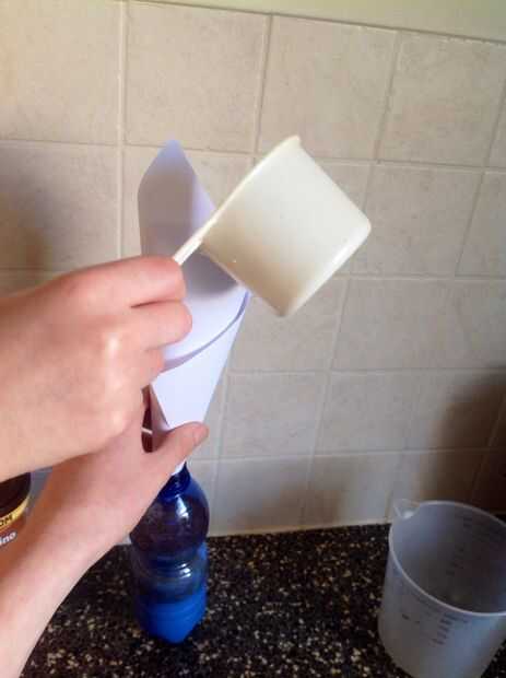 Tomar la botella y vierta la leche. Luego coloque el embudo o trozo de papel había enrollado en forma de cono en la botella y pone los ingredientes en él. Luego ponga la tapa en y sacúdalo.