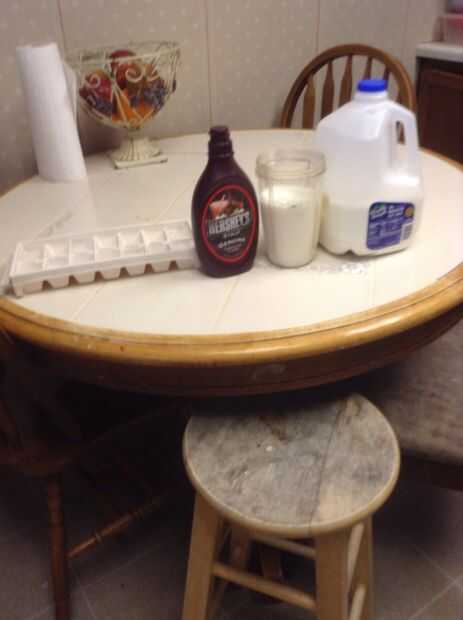 Necesita una licuadora, leche, cubitos de hielo 5 y cacao o chocolate cosas relacionadas.