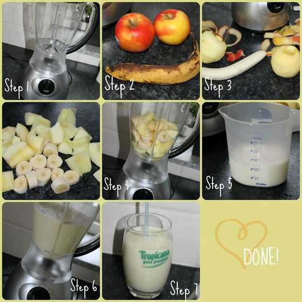 Para comenzar con, tomar una licuadora. Luego, tomar la fruta; 2 manzanas y 1 plátano. En tercer lugar, puede corta la fruta en trozos y ponerlo en la licuadora (paso 4). Después de eso, agregar 0,25 cl. leche o agua a la fruta. Posteriormente y mezclar durante un minuto en high. Por último, poner al batido en un vaso y beberlo! DELICIOSO!