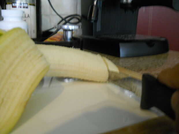 Luego, asegúrese de que el plátano es más o menos picado y ponerlo en la licuadora. * Quick Tip *: El plátano será lo más sabroso de la sacudida si se selecciona un plátano amarillo, agradable con una buena cantidad de puntos marrón en él.