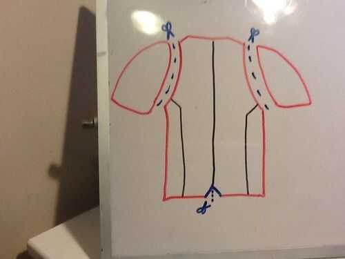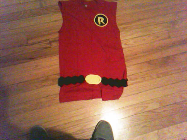 por debajo es una camisa de manga larga negra. Sobre que es una camisa de manga corta roja con algunas alteraciones. Cortar las mangas a lo largo de la costura. luego usé una máquina de coser y un hilo negro para hacer una línea por el medio y dos en el lado. Partí la camisa por la mitad de la parte inferior alrededor de un cuarto de pulgada