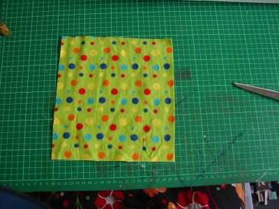 1. En primer lugar cortar dos trozos de tela a medida. No usar una regla. Sólo expuso en la almohadilla de corte y corte vagamente lo que quería. Salió unos 20cm cuadrado.