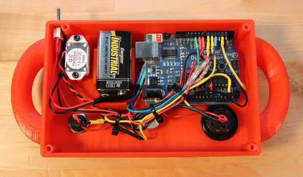 En caso que no lo has hecho ya, poner los LEDs en sus agujeros (poner un punto de pegamento en ellas si lo prefiere), coloque la placa Arduino, atornillar en los separadores, apriete las tuercas de sus botones, potenciómetro e interruptor de palanca, tornillo en su timbre y enchufe la batería de 9v.