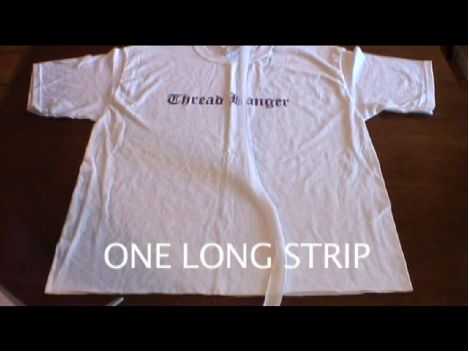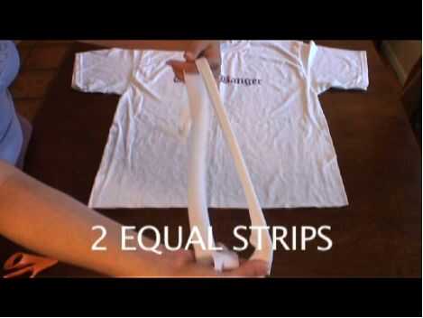 Tomar su camisa inferior y cortar 2 tiras de ancho de una pulgada de la parte inferior. Cortar una de las tiras en medio de una vez, por lo que tiene una tira larga (llamada tira 5). y el otro corte por la mitad dos veces, así que tienes dos iguales tiras (tiras de 6, 7). (Usted debe tener un total de siete tiras).