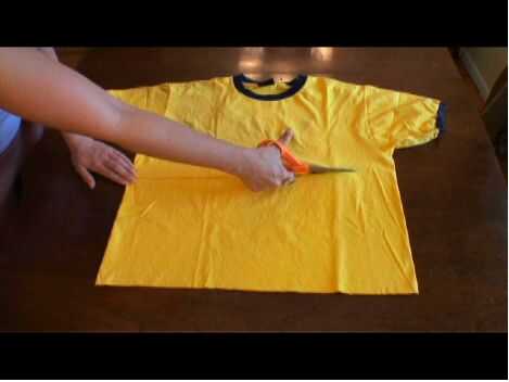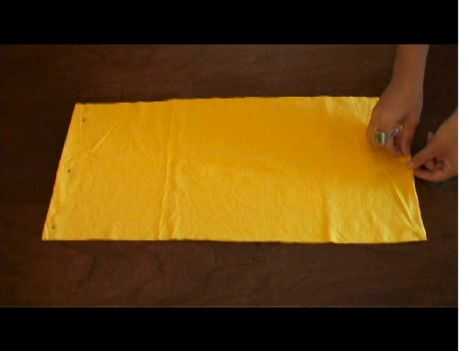 Ok, ahora toma tu camisa superior y corte de 9 pulgadas de la parte inferior, asegurándose de cortar a través de ambas capas de tela. PIN de las capas juntos y ahora parece una pieza de tela.