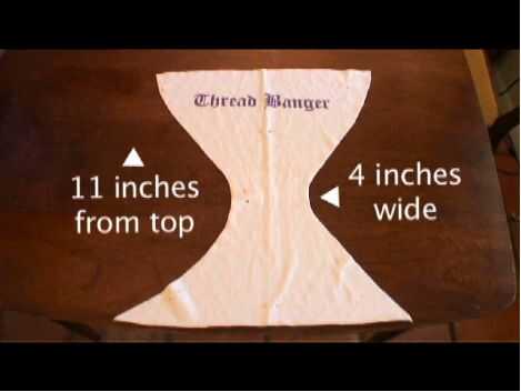 Tomar su camisa inferior y cortar un rectángulo que mide 19 pulgadas por 16 pulgadas. Prender juntos ambas capas del rectángulo. Entonces esboza una forma de cristal de la hora sobre la tela. Hacer primero un patrón de papel para la precisión. Desea que la parte más estrecha de la reloj de arena para medir 4 pulgadas a través y caen 11 pulgadas en la parte superior del rectángulo.