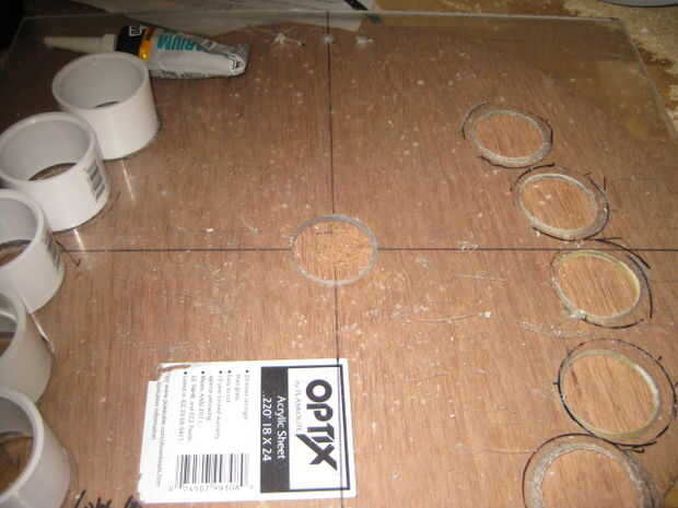 Medir 9 desde el borde y otra marca por el medio. Esto debería darte el centro exacto. Con el 2" pulgada broca, perfore un agujero en el centro exacto de plexiglás.