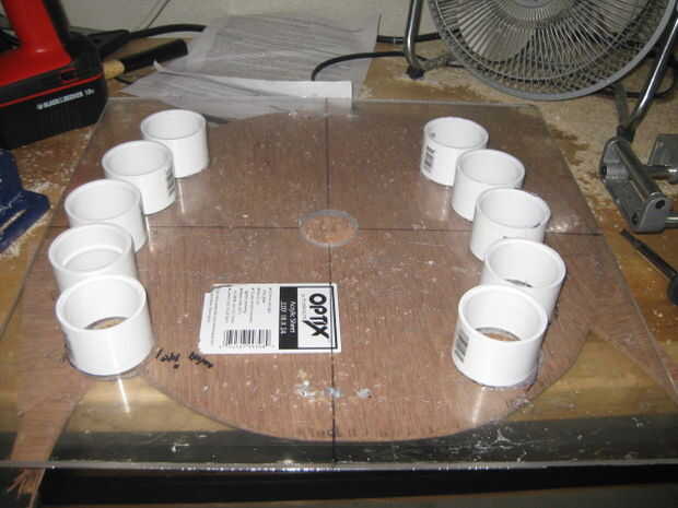 El plexiglás boca abajo en el Banco de trabajo y utilizando el cemento de PVC, coloque un cordón de pegamento alrededor del borde de los acopladores de 1.5" y montar en el plexiglás.