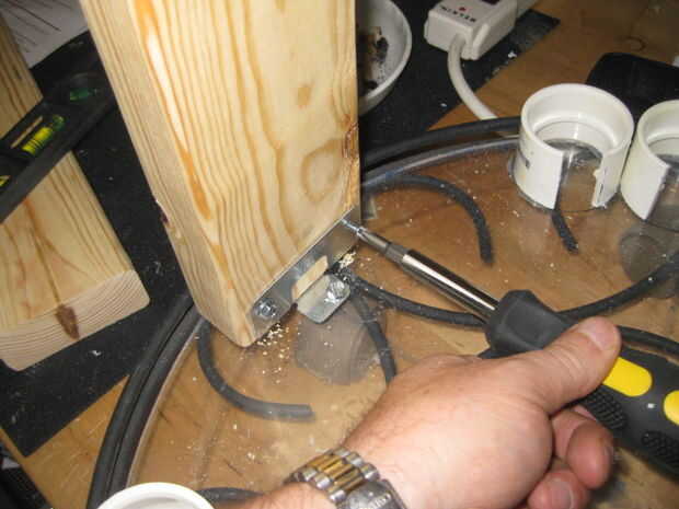Coloque el soporte de la planta en su banco de trabajo. Colocar el corte de 2 "x 4" del interior de los conectores de metal y tornillo junto con tornillos para madera.