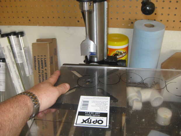 Colocar el plexiglás en el taladro y taladro con cuidado cada agujero marcado con un 1 3/4" pulgada broca.