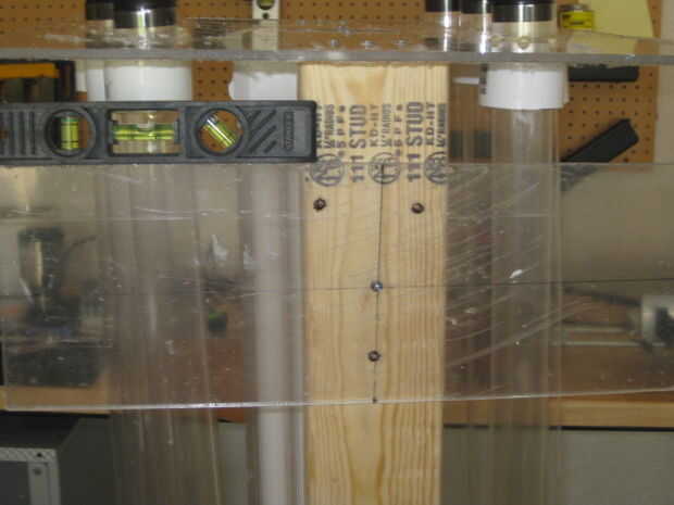 Monte el panel de control cross pieza directamente debajo del castillo superior, dejando 3 a 4 pulgadas de espacio entre el castillo superior y el panel de control. Atornille el tornillo medio, nivel y el tornillo en el resto de los tornillos.