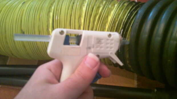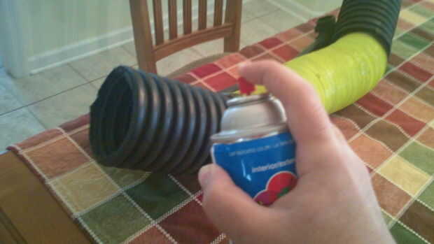 Deslice la secadora en sus secciones de pie y pegamento caliente. Si tienes algo mejor que el pegamento caliente, utilizarlo. Cuando hayas completado esto, y el pegamento se haya secado, pintura de aerosol ambos pies negros.