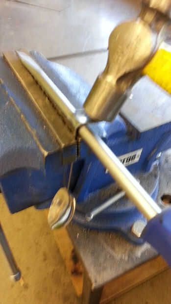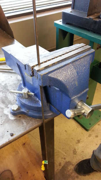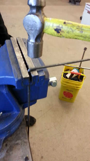 Ahora, coge la barra de acero. Fijarlo con la abrazadera en el tornillo de banco tal que 1/3 de su longitud total está por encima de la mordaza. Entonces, usar su martillo y doblar 90 grados.