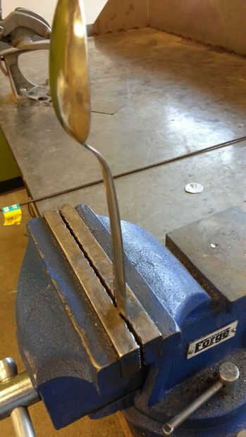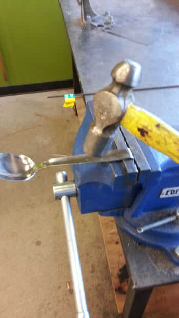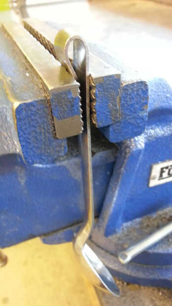Empezar por la cuchara en el tornillo de banco con cerca de 1" de lo afianzado con abrazadera de pie. Luego, doble hacia atrás. Utilizar el martillo para obtener una curva cerrada.