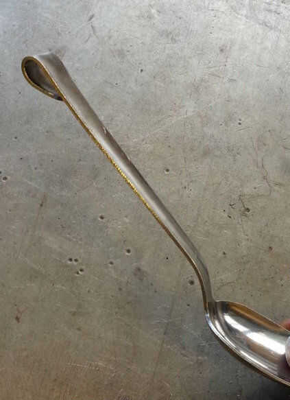 Una vez que llegue a 90 grados, dale la vuelta y colocar el destornillador por debajo de ella. Utilizar el martillo de nuevo para envolver el extremo de la cuchara alrededor de él. Esto le dará una curva con un radio amplio. Reclamp en la prensa de tornillo y cierre firmemente. En este punto, debe tener un circuito cerrado en la parte superior de la cuchara.