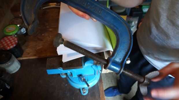 Utilizar trozos gruesos de madera como las placas de sujección para distribuir uniformemente la presión de la mordaza y sujetar el sándwich entero en la prensa o una prensa si tienes uno (pero si tienes una prensa, entonces usted probablemente no necesita este tutorial!)