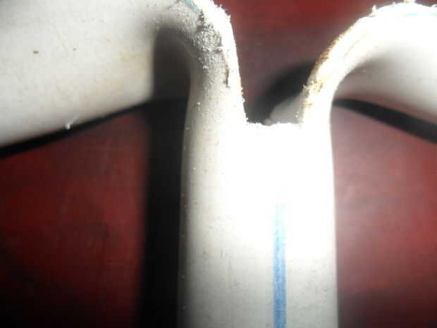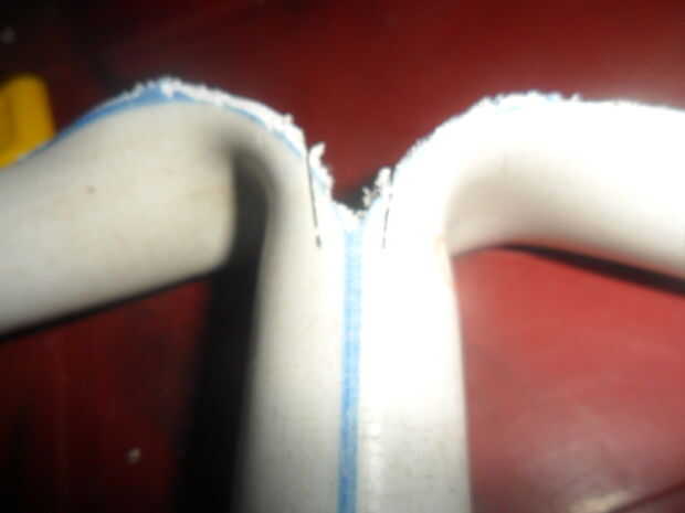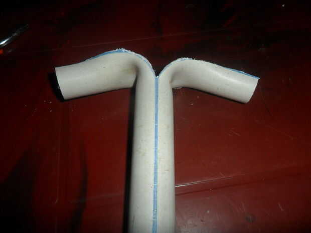 Calentar la mitad superior del pvc, doblar los dos lados abajo horizontalmente como se muestra en la foto 1, a continuación, cortan una muesca media un cm de ancho como se muestra en la fotos 2 y 3.