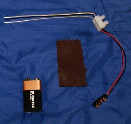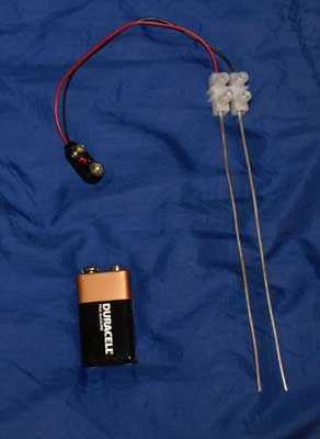 Tome la conexión de la batería de 9V y tira de que los extremos del cable por lo que 3/8" pelada en cada cable. Doblar el alambre desnudo en el punto medio de cada sección desnudo por lo que es un 3/16" doble de alambre desnudo. Esto le dará al tornillo de bloque de terminales más para agarrar a. Inserte un cable en cada uno de los polos en la terminal enfrente de las 99.9% puro fino plata los cables. (ver foto).
