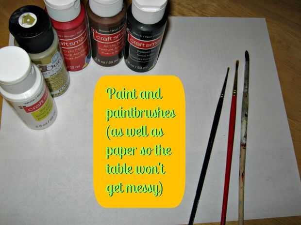 También es bueno tener toallas de papel para limpiar los cepillos, periódico para colocar en la mesa para que no te pintura en él, una taza de agua para enjuagar sus pinceles en y un plato de papel para mezclar la pintura.