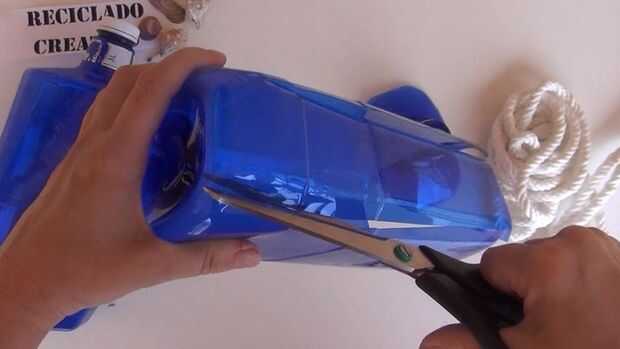 Pasos:-1. Retire la etiqueta de la botella. 2. Quite la parte inferior de la botella con la navaja. 3. Mida la distancia entre cada corte. (1 cm) 4. hacer cortes en la botella. 5. Retire el cuello con la navaja. 6. Corte la parte superior de otra bot