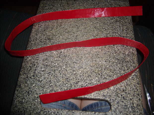 hora de que las correas! medirlos a su gusto. hice largo b y c que me gusta mis bolsas para colgar bajo la mina. tomar dos tiras de cinta adhesiva y coloque uno en el centro de su espacio de trabajo. Coloque la otra tira de cinta horizontalmente en el centro de la primera pieza de la cinta. debe tener una buena cantidad del lado adhesivo en la parte superior e inferior. doblar las partes pegajosas para hacer una tira larga no-pegajoso.