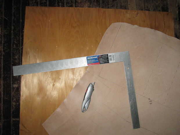 1. Colocar la piel sobre la superficie del corte - he utilizado madera contrachapada de 3/8