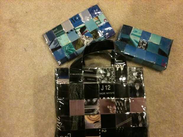 o 2 piezas de igual dimensión y otro 2 piezas diferentes con una pieza de fondo y la cinta a todos juntos para hacer un bolso de mano! para hacer las asas, dobla una página en una tira y laminado.