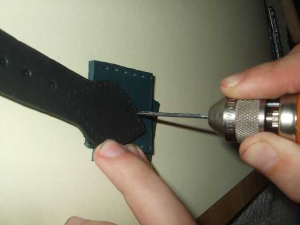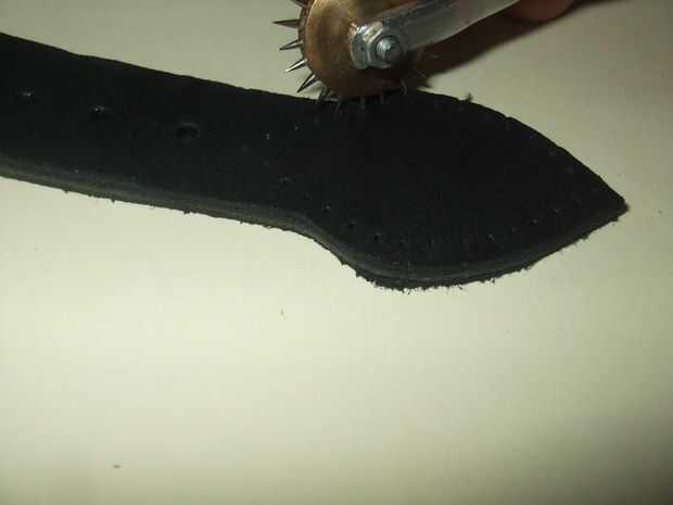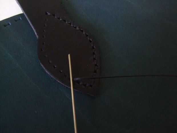 Las piezas a coser deben colocarse antes de la guarnición para que puedo conseguir una superficie orgánica, entonces ocultar el hilo. En este punto yo coser encima de las hebillas y correa de mano. Primero marcan el lugar de pinchazos con ruedecilla, después de los finalizar con un punzón. Finalmente fije las piezas con la costura de silla de montar.