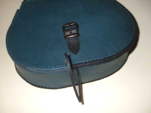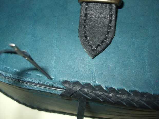 Corté los cordones del resto de la guarnición de cuero, ajustado al tamaño de los agujeros (3 mm de ancho) y luego que encaje alrededor de la bolsa. Yo uso "triple cordón de lazo", pero puede utilizar otras técnicas de cordón como usted desea. Recomiendo leer el libro "Cordones y costuras para Boutique", usted puede encontrar muchas técnicas útiles en él.