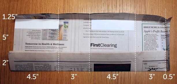 Doble una aleta 1.25" hacia abajo desde la parte superior. Doblar una aleta de 2" de la parte inferior. Mida entonces y hacer dobleces verticales en los lugares que se muestra en el diagrama anterior. Los paneles frontales y posterior son 4.5" de ancho, los refuerzos laterales son 3" de ancho y tendrá 0.5" la solapa para pegar la bolsa.