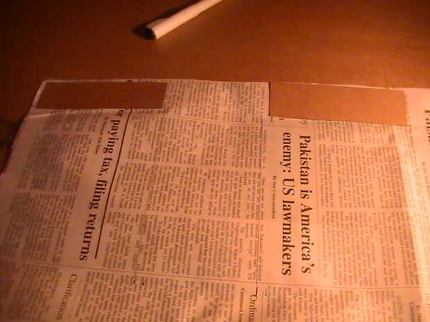 Corte dos pedazos de cartón a 4,25 "x 1", y luego pegarlos en los dos paneles más anchos justo debajo de la tapa superior. Éstos fortalecen el borde de la bolsa. Pegar la solapa superior hacia abajo a lo largo de la longitud del bolso, cubriendo el cartón.