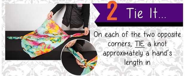 Atar un nudo (ver esta video guía) aproximadamente una longitud de manos en las dos esquinas opuestas del cuadrado