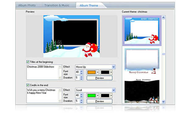 Photo DVD Maker es intuitiva, buscando slick y fácil de navegar. Este programa ofrece un montón de características y funciones excepcionales. Con este fabricante de diapositivas de foto de Navidad, es fácil de hacer su propia Navidad DVD slideshow y slideshow video.