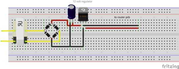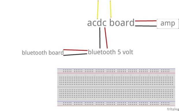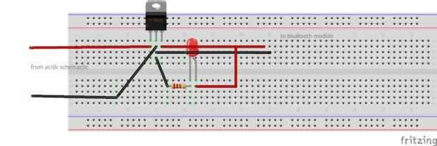 Los componentes electrónicos son muy fáciles de soldar. El circuito del transformador AC/DC, hacer un rectificador o comprar uno, poner paralelo a la salida del rectificador un capacitor de 2000 uf a continuación, utilice el regulador de 12 voltios con un disipador de calor o se destruye el regulador, por último en el de 12 voltios de salida, hacer los cables que van al circuito con el led y 12 voltios para el amplificador. Luego el circuito con LED, este circuito dar 5 voltios a la placa del módulo Bluetooth, obtener su regulador de 5 voltios y la soldadura de los cables con un led y resistencia en la salida para la notificación. Utilizar la imagen que muestra que tarjetas son conectadas a las que.
