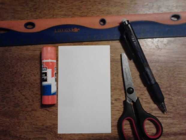 Materiales: -Tarjeta (cualquier tamaño, pero 5 x 3 pulgadas es preferido para la medición más fácil) -Pegamento stick -Regla (opcional) -lápiz (uso opcional, si usted quiere marcar algunas mediciones) -Tijeras