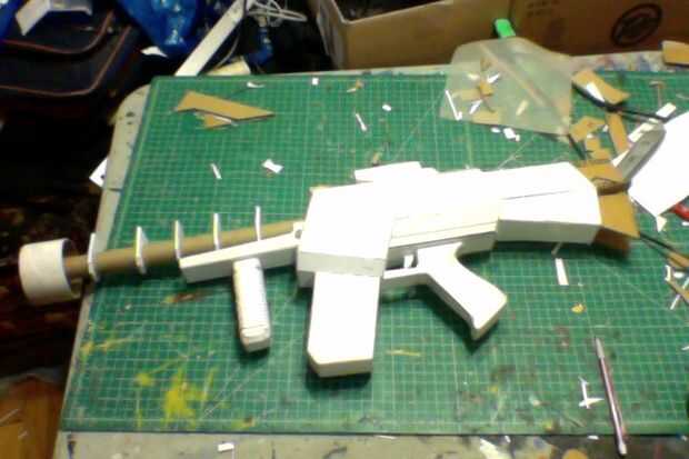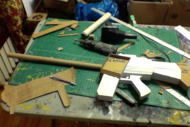1. Tome el tubo largo de cartón y corte un orificio en la parte delantera de la pistola. Puede utilizar la plantilla para determinar cuánto debe ser el barril.