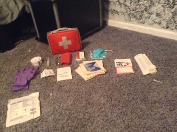 Necesita (que nunca es necesario): par de guantes, curitas surtidas, almohadilla de preparación alcohol, tijeras, bolsa desechables bio-hazard, manta de rescate, guía de primeros auxilios, cojines quirúrgicos y cinta