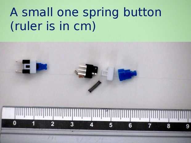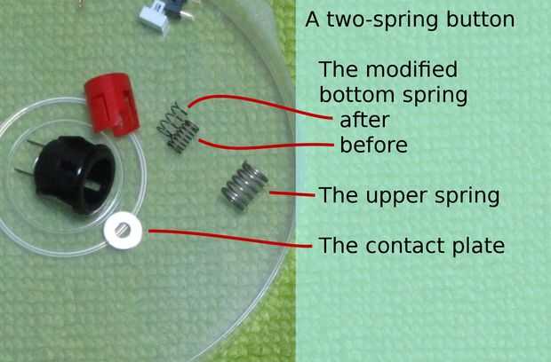 Hay tres tipos básicos de botones: un resorte, dos resortes y sin botones de resorte. Los tipos de primavera no son lo que verías en una calculadora o teclado y uso una goma clara para elasticidad. Ya necesitan tan poca fuerza que si se usaban, probablemente no necesita este tutorial. Dos botones de primavera más probables sostener una placa de contacto entre los resortes. Desea modificar el resorte de la parte inferior y no la parte superior. Para los botones de resorte uno, sólo tienes un resorte para elegir.