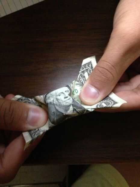 su origami muy fácil y todo lo que necesitas es... UN DÓLAR!Paso 1: Paso uno Inicio doblando el bajo de los cantos largos bastante a cebada sólo toque el número 1Paso 2: Paso 2 a continuación doble el papel por la mitad dos veces y asegúrese de que e