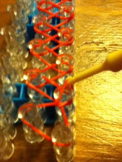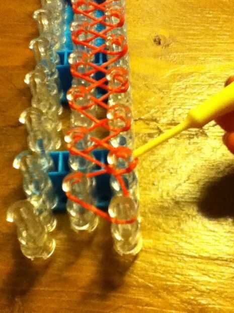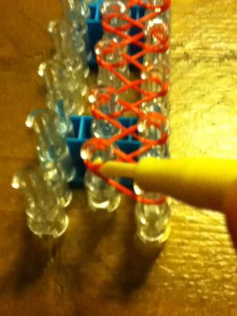 Ahora, tienes que voltear el telar entero (de modo que la flecha roja apunta hacia abajo). Entonces, su gancho del gancho agarrador y saltar la primera clavija y llegar a la primera banda y agarra el segundo con su gancho, el traer a la tercera clavija y fíjelo. Continúe este paso hasta llegar al final.