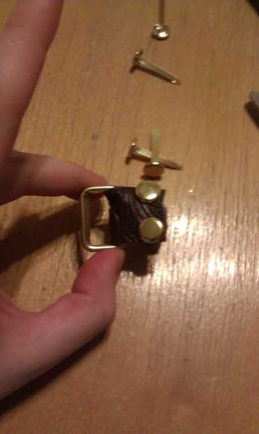 3.) los tirantes delgados son lo que vas a utilizar para la fijación de los anillos en D para su brazal. Tienen que ser lo suficientemente largos para bucle alrededor de un par de anillas y acomodar la cabeza de uno de los remaches de latón, como se ve arriba.