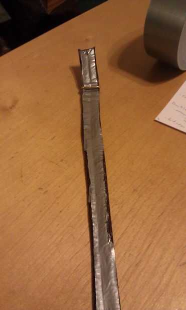 9.) doble los dos bordes laterales de la correa gruesa para que se reúnan en el centro, con la parte delantera de la tela hacia fuera. Conducto de cinta los bordes en su lugar, asegurándose de que la cinta no se ajusta al otro lado de la correa. Sé que esto suena mal, pero la cinta del conducto no será visible cuando usted está usando el Guardabrazos y brazales.