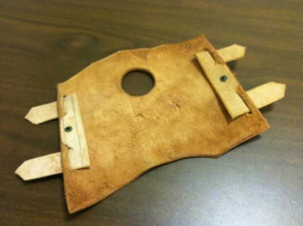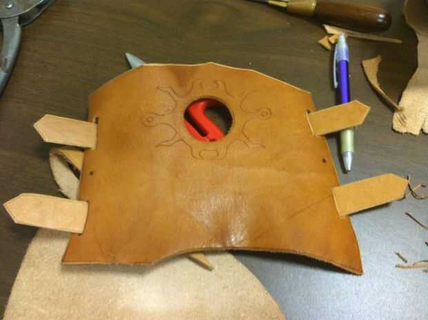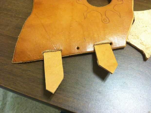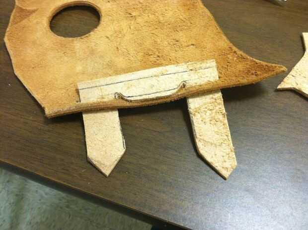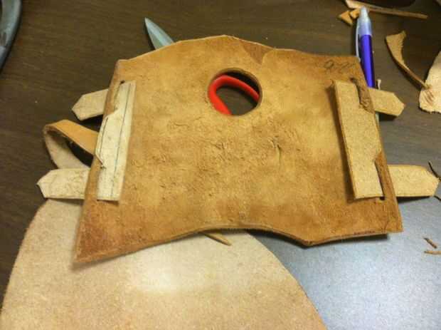 Si las correas fueron a través de todo el asunto que tendría que ser clavado a él o de lo contrario el brazal hasta y especie de "desinflar". No tenía ganas de perforar agujeros más tan en su lugar que surgió la idea de hacer las correas en una especie de forma de U (me recuerdan a las naves de reconocedor de Tron), por lo que no necesitan ser remachada en todos. Al mismo tiempo cruzan bajo ese agujero de repuesto para poder clavarlos y dar eso agujero de algún propósito. Así lo hice. Por supuesto luego tuve que quitar uno y reemplazarlo por uno con correas más largas pero todo funcionó.