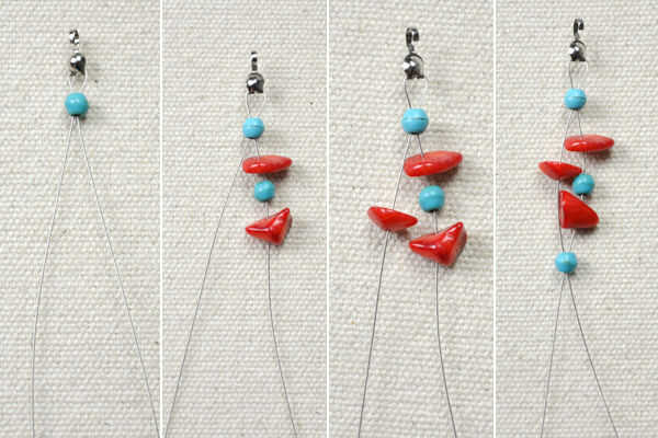 diapositiva 2, una gota turquesa en ambos alambres, deslice una tira coral, una gota turquesa en el cable correcto, añadir una gota coral sobre el cable otra vez, deslice una tira coral en el hilo izquierdo y luego añadir una gota turquesa en ambos alambres Este es el comienzo de la primera cadena;