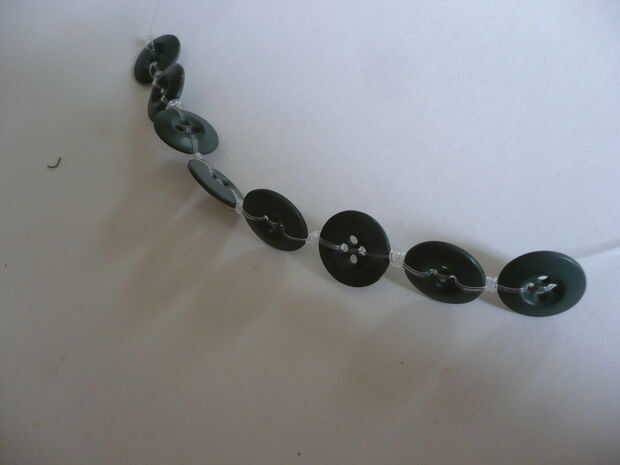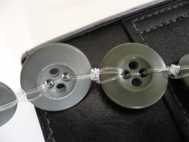 Atar el hilo en el agujero del sur con un nudo doble. Puede que necesite Utilice alicates para apretar el primer nudo como nylon es resbaladizo. Empuje el hilo por el agujero del norte y luego por el agujero del sur un segundo botón y luego de nuevo en el agujero del norte del primer botón. Ahora deberás de viento (ver mi foto) el hilo alrededor de la actual hilo o lazo que usted acaba de hacer. Una vez ha venteado en alrededor de un par de veces, tal vez 5 veces, pase el hilo por el agujero del sur en el 2 º botón. Repita este paso hasta que ya tienes suficientes botones para casi dar la vuelta a la muñeca. Ahora debe tener una serie de botones.