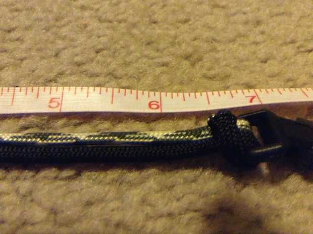 Por cada pulgada que el paracord en la muñeca luego utilizar un pie de la cuerda para iniciar así la cuerda para ser 7 en utilizar 7 pies de cuerdas (4 pies de cada cuerda)