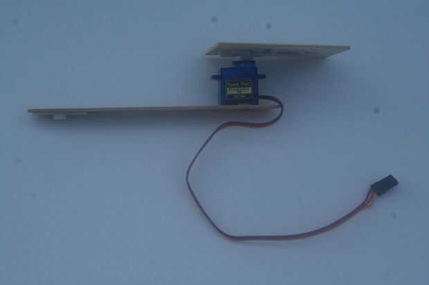 Cuerno de un servo de cola caliente a un palito. Al colocar la paleta horizontalmente el cuerno del servo debe estar en el lado izquierdo. En el completo opuesto lado del servo horn debe ser el lugar en que usted caliente pegue otro servo.