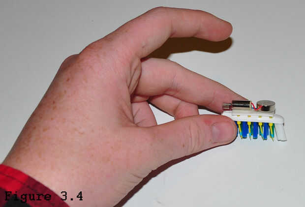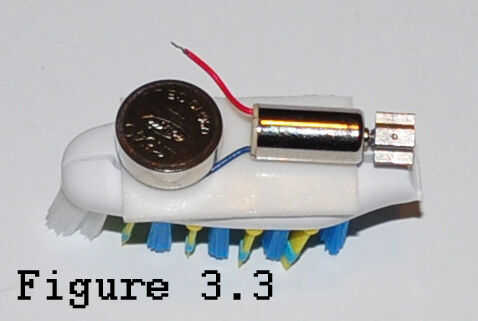Pegar de un lado para el cabezal del cepillo y luego coloque el motor sobre la cinta. Coloque el cable azul de la cinta y coloque el lado negativo de la batería en la parte superior para que conectan el cable y la batería. (Figura 3.3)