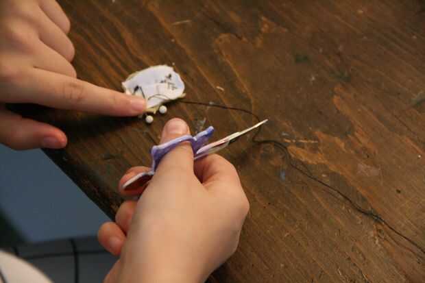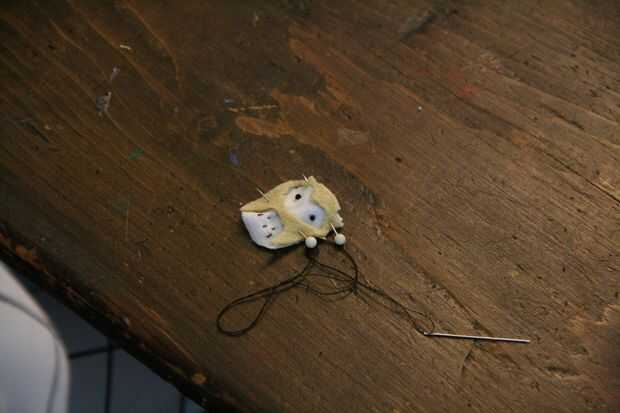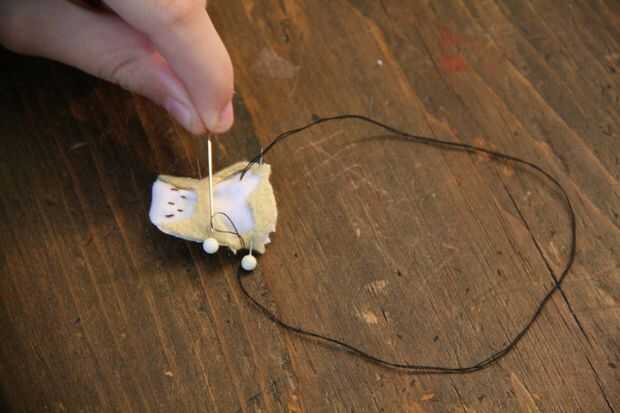Para el pico, colocarlo donde usted quiere que vaya en la cara de buhos. Luego meter una aguja con hilo marrón hacia arriba al lado de él de la parte posterior y tire a través. Tire al otro lado en el pico. Luego empujar hacia arriba desde el otro lado del pico y tire de ella hacia atrás al otro lado en el medio otra vez.
