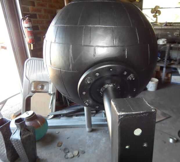 Hice un soporte fuera de un cuadrado de 50 x 50 mm sección de hueco y había unido a la brida en la parte posterior de la estrella de la muerte. Estrella de la muerte se lleva a cabo lejos del soporte por algunos tubos de acero - este es mi intento de hacerlo parece estar flotando. Es todo sueldan sólidamente.